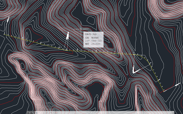3. 道路中心線と地形を選択すると、道路を通すルートの現況地形が作図される(縦断面図)。